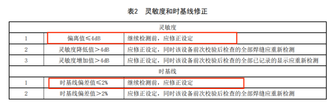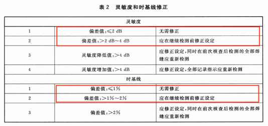 11 | 10 時(shí)基線和靈敏度設(shè)定 10.1 概述 依據(jù)本標(biāo)準(zhǔn)和附錄E要求,每次檢測(cè)前應(yīng)設(shè)定時(shí)基線和靈敏度,并考慮溫度的影響。時(shí)基線和靈敏度設(shè)定時(shí)的溫度與焊縫檢測(cè)時(shí)的溫度之差不應(yīng)超過(guò)15℃。檢測(cè)過(guò)程中至少每4小時(shí)或檢測(cè)結(jié)束時(shí),應(yīng)對(duì)時(shí)基線和靈敏度設(shè)定進(jìn)行校驗(yàn)。當(dāng)系統(tǒng)參數(shù)發(fā)生變化或等同設(shè)定變化受到質(zhì)疑時(shí),也應(yīng)重新校驗(yàn)。如果在檢測(cè)過(guò)程中發(fā)現(xiàn)偏離,應(yīng)按表2要求進(jìn)行修正。 ![]() | 11 時(shí)基線和靈敏度設(shè)定 11.1 總體要求 按照本文件和ISO16811的規(guī)定,每次檢測(cè)前應(yīng)設(shè)定時(shí)基線和靈敏度,并考慮溫度的影響。時(shí)基線和靈敏度設(shè)定時(shí)的溫度與焊縫檢測(cè)時(shí)的溫度之差不應(yīng)超過(guò)15℃。 檢測(cè)中至少每4h或檢測(cè)結(jié)束時(shí),應(yīng)核查時(shí)基線和靈敏度設(shè)定。當(dāng)系統(tǒng)參數(shù)發(fā)生變化或等同設(shè)定變化受到質(zhì)疑時(shí),也應(yīng)重新核查時(shí)基線和靈敏度設(shè)定。 如果在核查過(guò)程中發(fā)現(xiàn)靈敏度偏差值大于2dB或時(shí)基線偏差值大于1%,應(yīng)按表2進(jìn)行修正。 ![]() | 更改了靈敏度和時(shí)基線修正要求(見(jiàn)表2,2013年版的表2) |